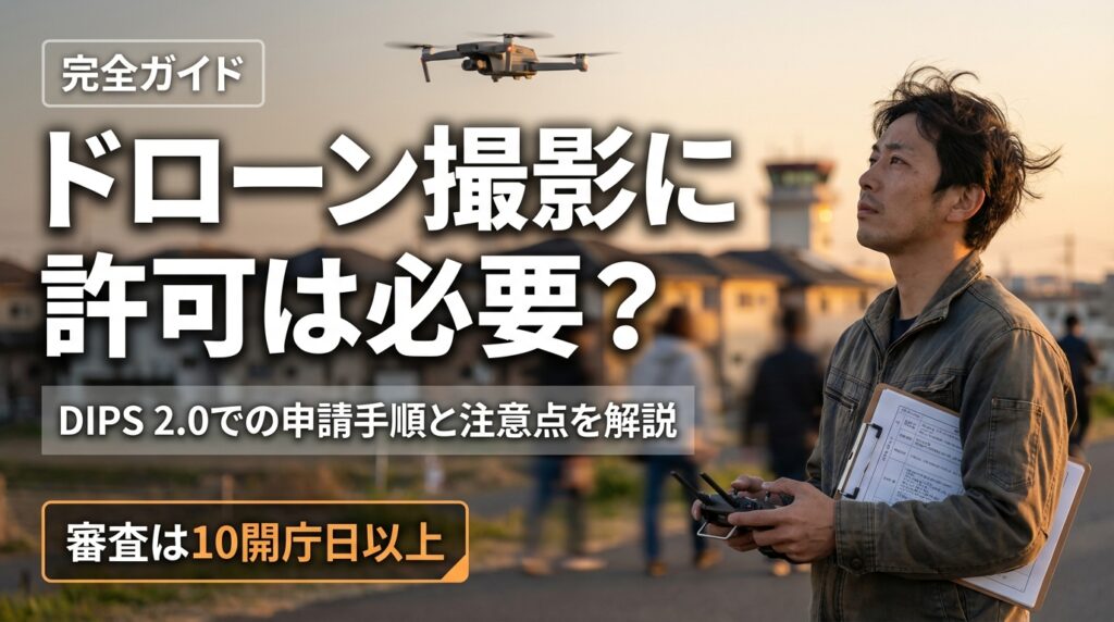 ドローン撮影は、禁止空域や夜間・目視外飛行など特定の飛行方法を用いる場合に、国土交通省の許可・承認が必要です。申請はDIPS 2.0で無料、審査は10開庁日以上が目安です。許可後も飛行計画の通報と飛行日誌の作成が義務付けられており、違反時は最大30... -